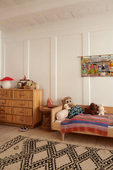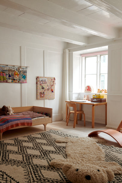 The Caravan Crib is turned into a junior bed by adding this Caravan Conversion Kit. The bed also works as a day bed, and is used for play and cosy time. A vintage Alvar Aalto table and chair set is placed by the window, with colourful suitcases used for storage. On the pin board hangs the Flag Garland. On the floor lies a polar bear rug from Helle Høgsbro Krag, and a balance board from Stabelstein.