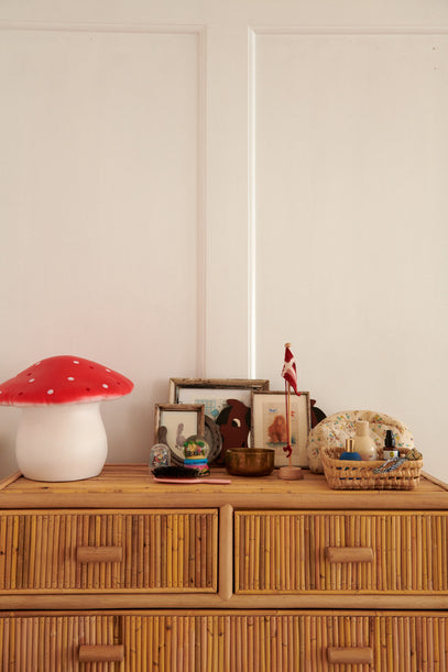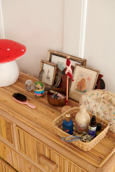 The Mini Library holds toys, books and little suitcases plus Bobbie's favourite pair of boots. On top of it is a pink Mushroom Lamp, a Knitted Cactus and more wooden toys.