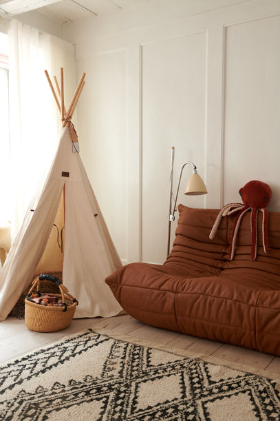 The tipi is a fun place to hide and play (find a similar play tent here). The vintage Togo Couch with its rounded edges and low height is perfect for the play room.