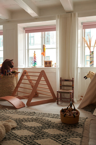 A large basket stores all Bobbie's soft toys, while a climbing tower and balance board allow for active fun inside. A large rug adds softness and warmth to the room.