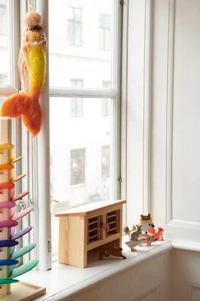 Wooden animals and a little wooden shed are placed in the window still, making a wonderful match with the mermaid and rainbow-coloured tree from Magic Wood.