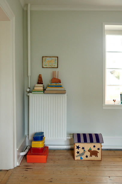 By the door to the living room you will find suitcases for storage, as well as a medium-sized storage basket for toys. In the window little wooden animals are balancing.