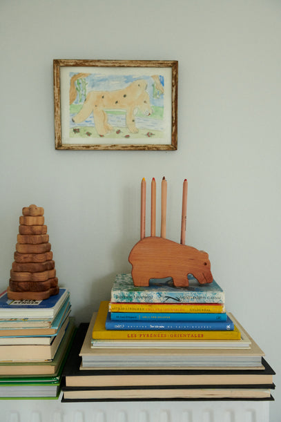 Books used as display. On top an old hippopotamus holding pencils. On the wall, a framed drawing of a tiger by Elios auntie, made when she was a child.