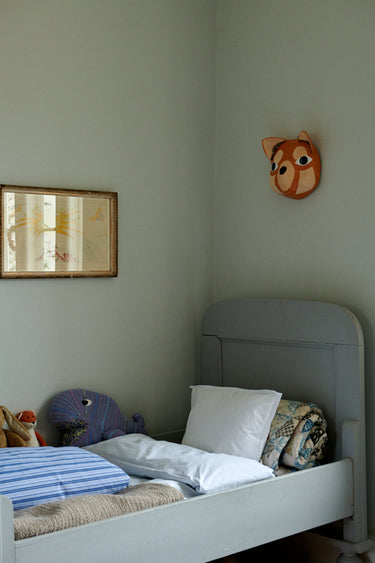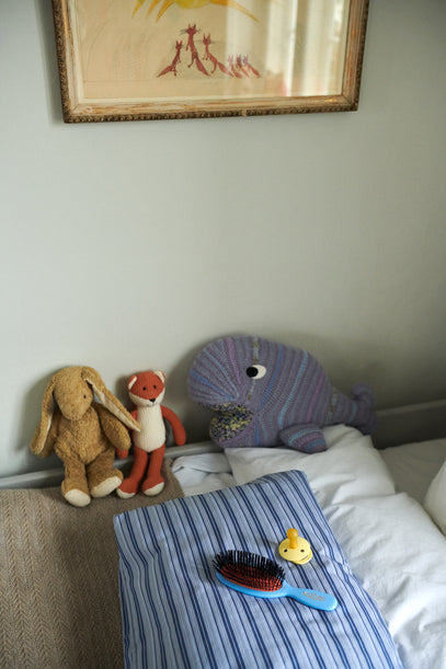 Crisp, white bedding paired with blue striped bedding on a baby duvet, and colourful teddies. The knitted whale is from Helle Høgsbro Krag, and on top of the striped bedding lies a brush and a sunshine yellow pacifier.