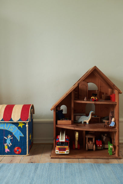 The practical and pretty circus storage basket next a handmade, wooden house filled with wooden animals, tiny wooden furniture – and a fire truck.