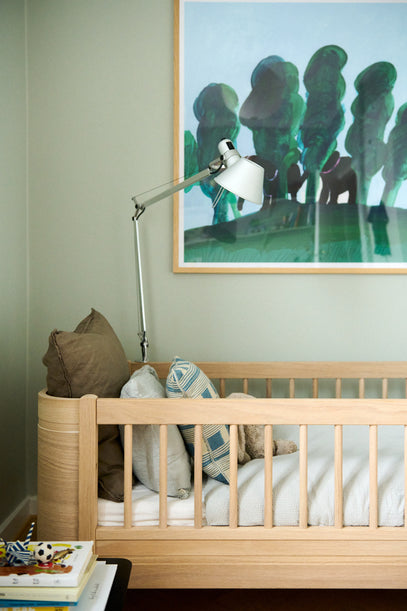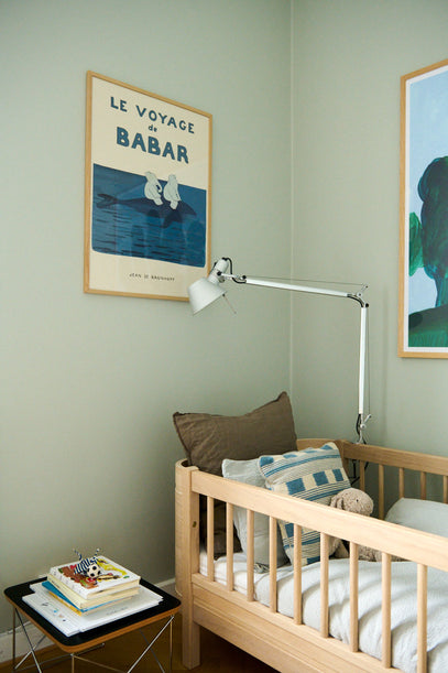 The walls have been painted with 'Cromarty' from Farrow and Ball – a different colour from the rest of the home to illustrate that this is Theo's room. The light green pairs well with the 'Elefanterne Gemmer Sig' poster.