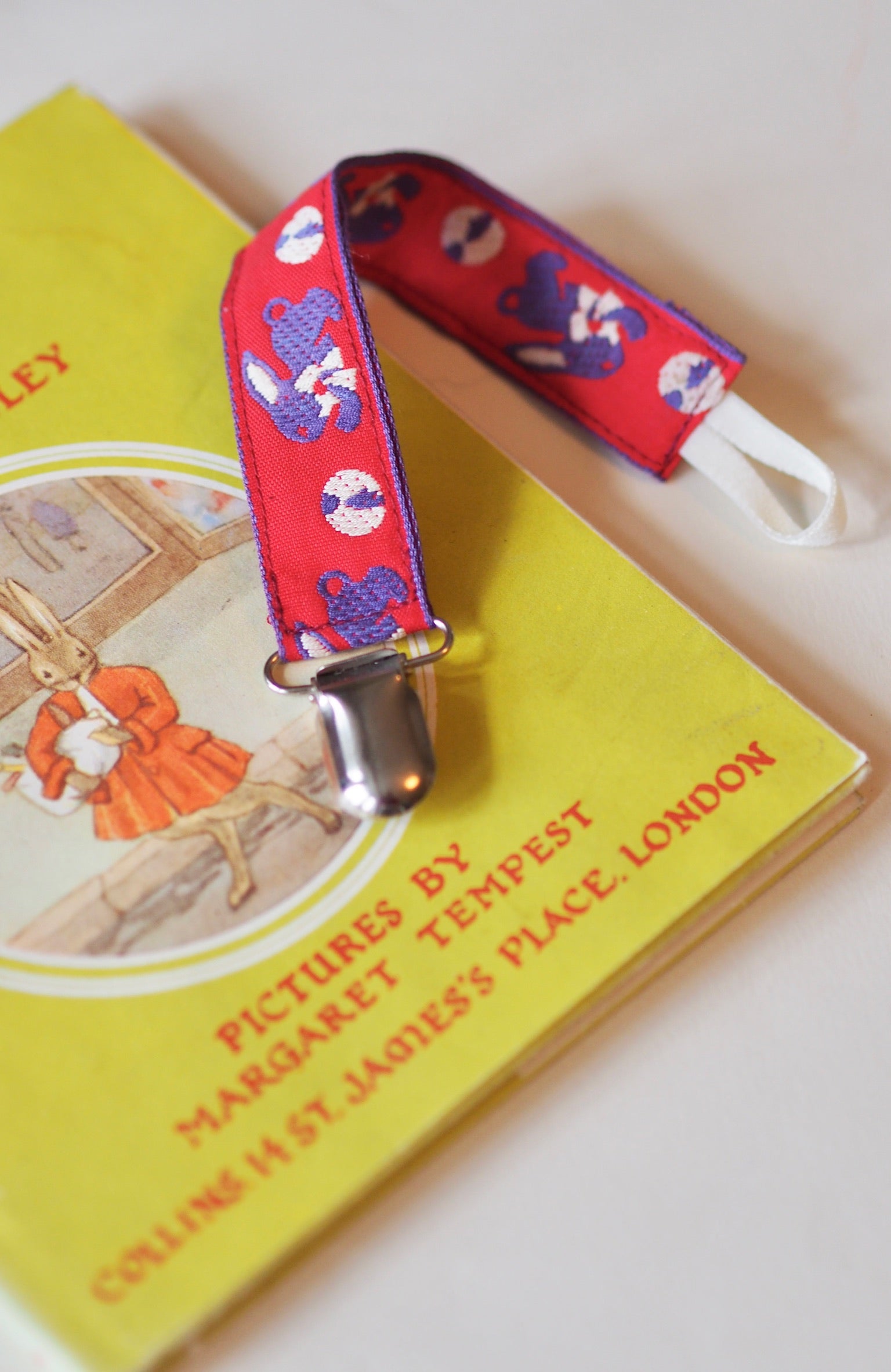 The Pacifier Clips are handmade from vintage ribbon and fabrics. They come with a metal clip, and elastic band to attach the pacifier to the string. Explore our matching pacifiers here.