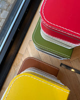 This cardboard suitcase come with cream coloured thread overstitching, and with a metal lining protecting the edges.