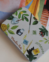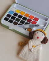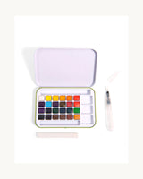 A smart brush that holds water is included. Store the watercolours in the metal box provided.