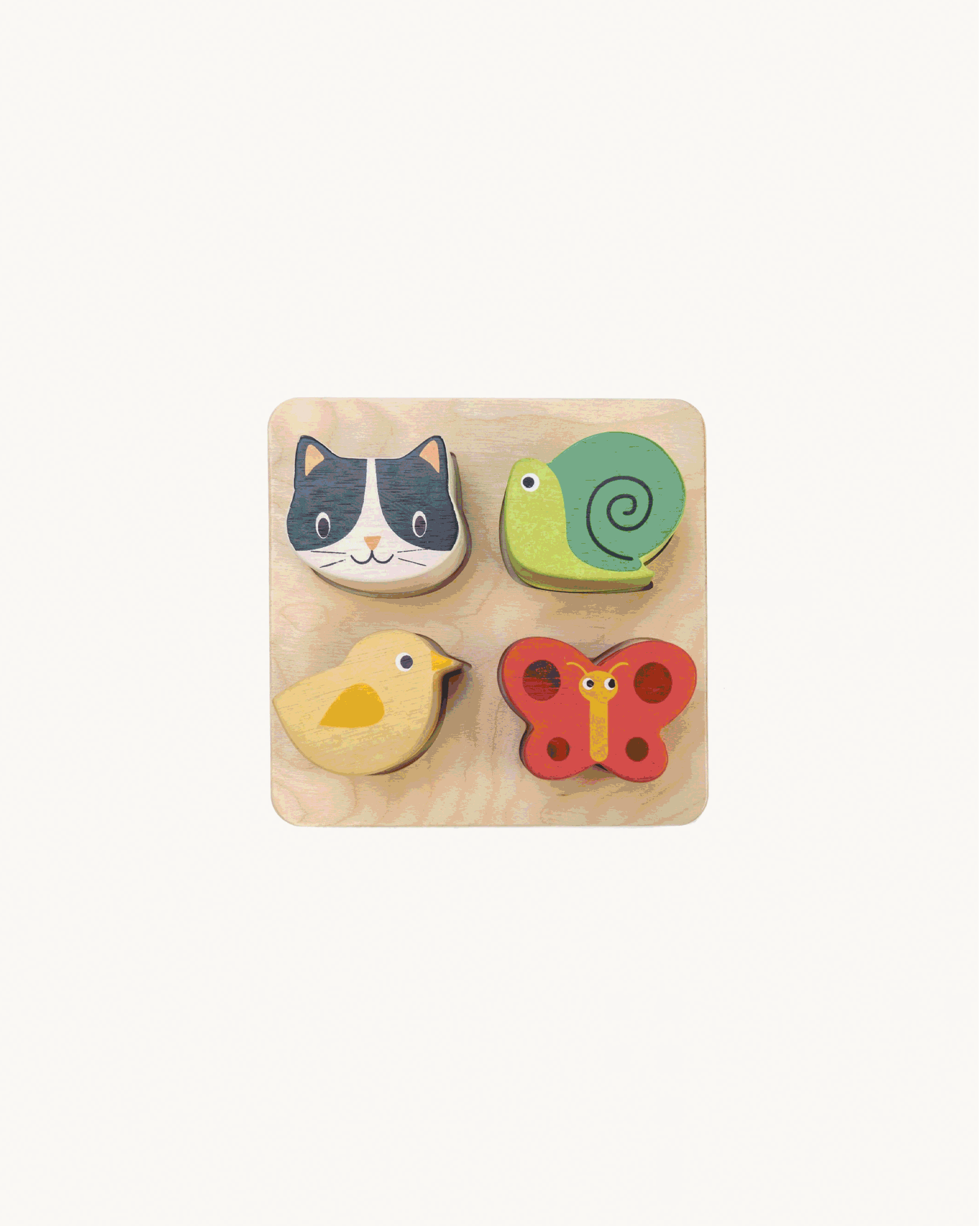 This set includes 4 solid wood animal shapes with different tactile patches underneath, presented on a shape sorter tray. Encourages color and shape recognition through play.