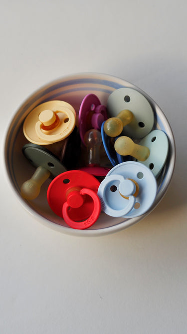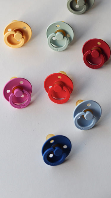 Matching our handmade pacifier clips, these 100% natural rubber latex pacifiers come in a variety of beautiful colours.