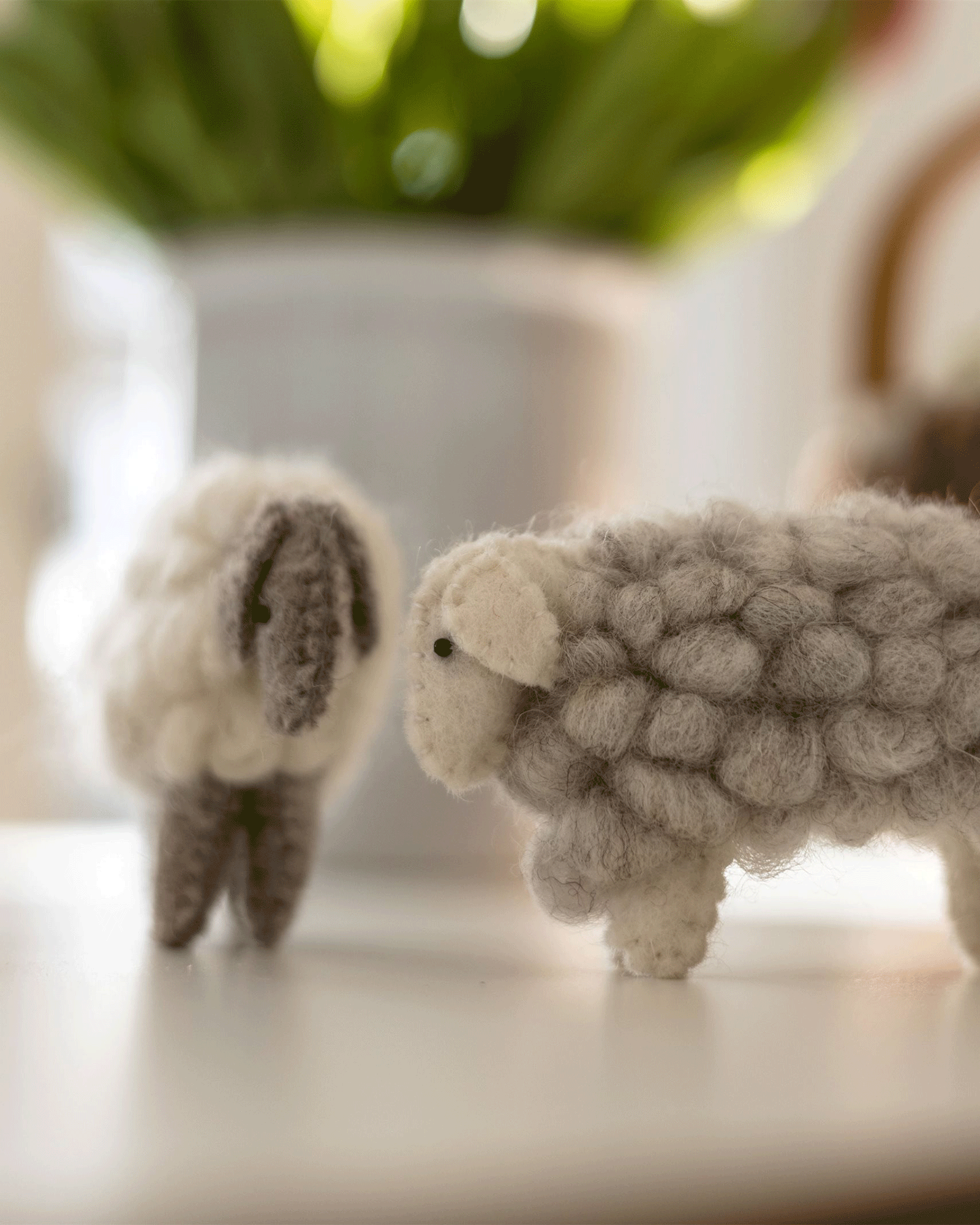 These lambs are handmade in Nepal and made from 100% wool. They come in grey and white and are available in two colours. Small variations between them may be expected as they are made by hand.
