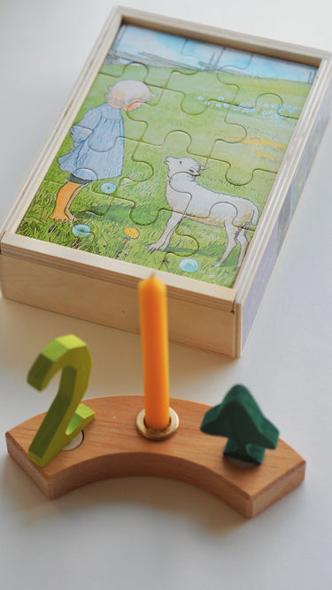 Traditionally, a candle for each year of your child’s age is pegged into the birthday ring. The other holes can be filled with painted wooden figures. The birthday ring can be easily customized. Kids can choose what figures to decorate the ring with based on their interests.