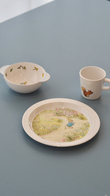A practical melamine bowl that is beautifully decorated with illustrations of Peter the Rabbit.