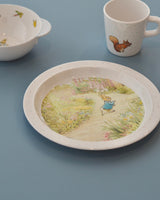 A beautiful melamine plate that is beautifully decorated with illustrations of Peter the Rabbit.