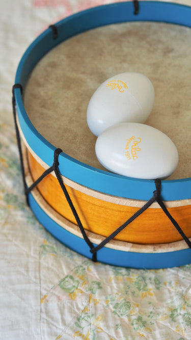 This colourful, classic drum is made from wood and real skin, and comes with two wooden drum sticks. The drum is ready to be carried around and may be played on, on both sides.
