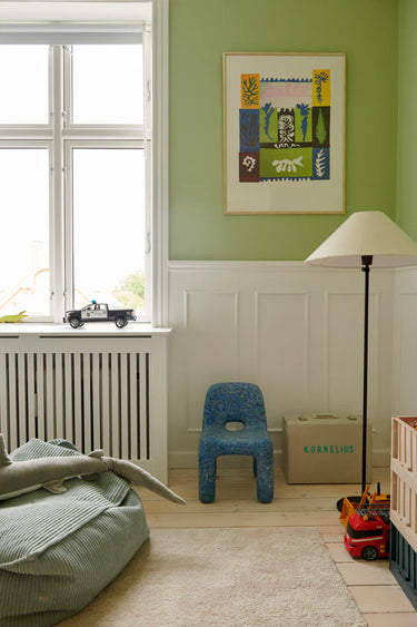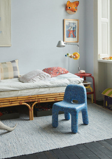 This is the Charlie Chair – a chubby, playful little chair. It might look heavy, but it only weighs 2,9 kg. making it easy to move around the house, even for children. Its soft forms and rounded edges, and its sturdy body and legs, make this a great chair for toddlers and kids.