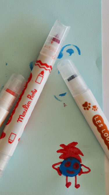 8 large felt-tip pens with two functions: a double-thickness tip on one side and a stamp on the other. They are perfect for bringing the most beautiful creations to life and decorating them with pretty patterns. These pens are washable.