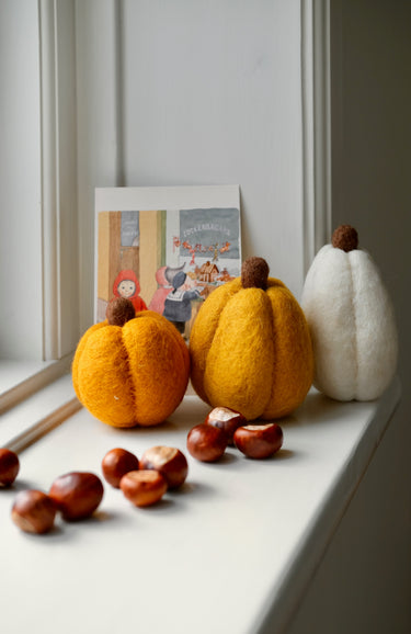 Three beautiful pumpkins – handcrafted in Nepal, carefully made by skilled female artisans. One set includes three pumpkins, and may be used as decorations as well as toys in the play kitchen.