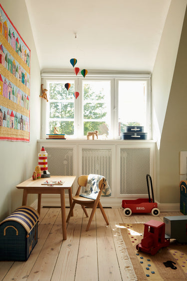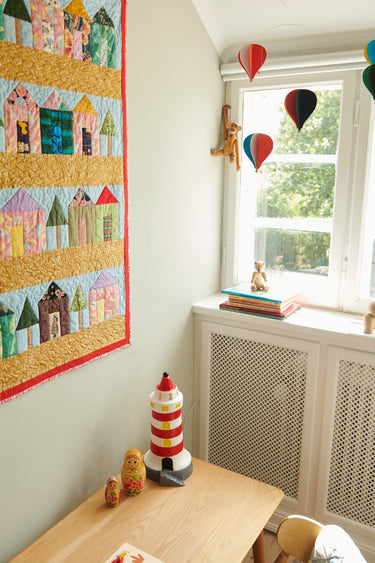 The design for this mobile has been inspired by the "Montgolfières" of the 18th century and modern hot air balloons. The Five Balloon mobile is one of Flensted Mobile's most iconic and popular mobiles.