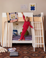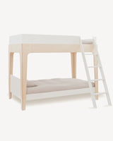 The Perch Bunk Bed meets all European safety standards. It’s built from solid birch and Baltic birch plywood, and has a sturdy frame and solid rails on top. It is lower than most conventional bunk beds, making access for kids safer, and good-night-kisses for adults easier. The bunk fits mattresses sized 90 x 200 cm available for purchase here. The ladder may be securely attached on either side of the bed, depending on the layout of the room.