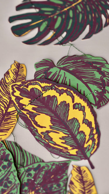 Beautiful garland in green and yellow shades with ten leaves strung along a three-meter cord. Perfect for a child's room to add a pop of color or create a festive atmosphere for special occasions.