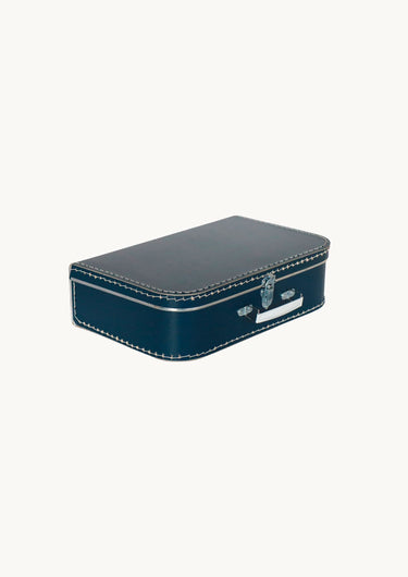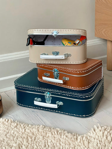 This cardboard suitcase come with cream coloured thread overstitching, and with a metal lining protecting the edges.