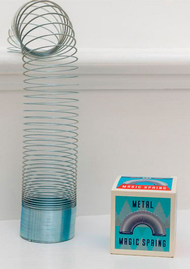 It features a metal spring which can walk down the stairs, when placed on the top stair and then given a gentle push.