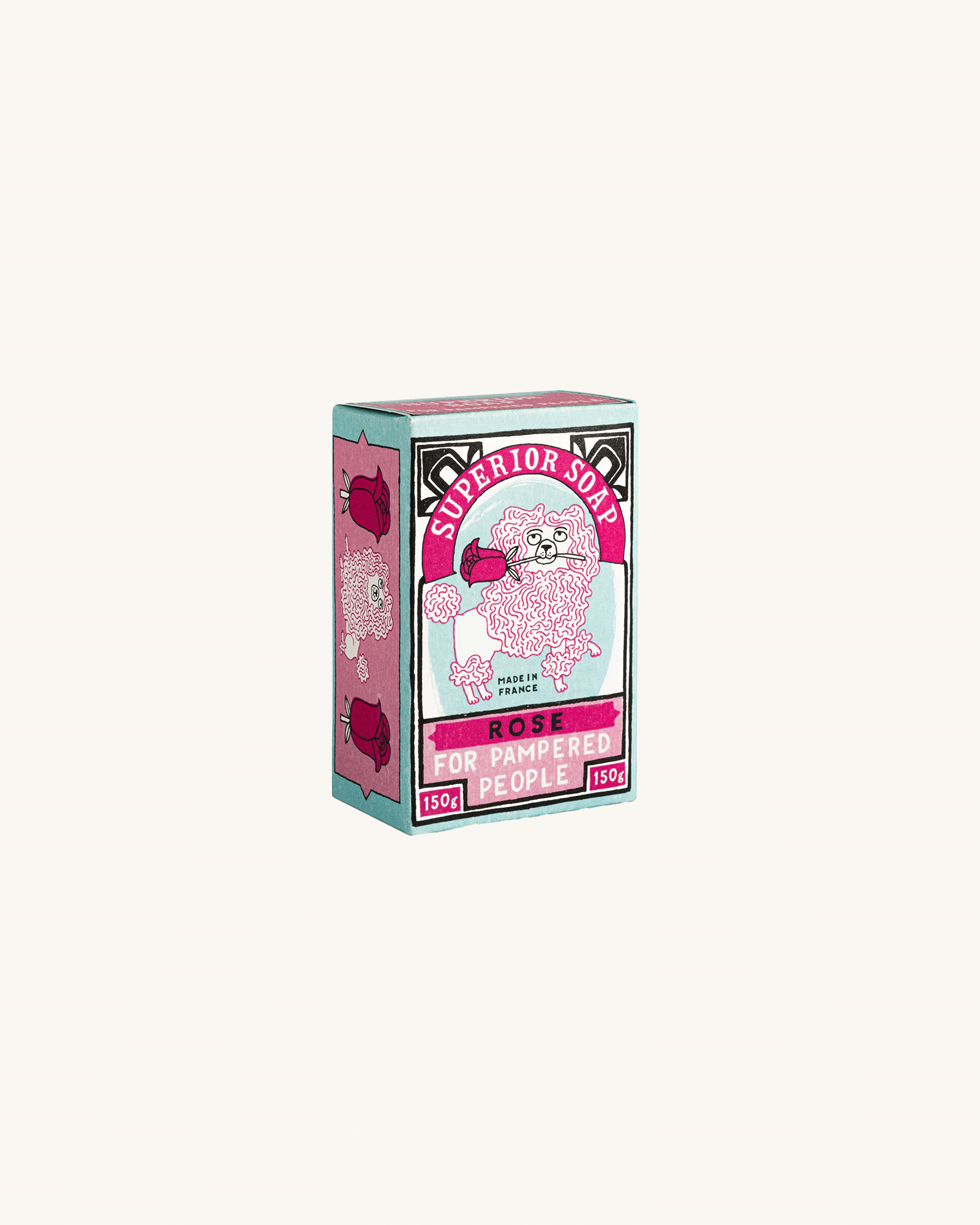 The Savon d'Archivist rose scented pink soap embossed with a poodle comes in a bold pink and blue decorative packaging that features a grumpy poodle.