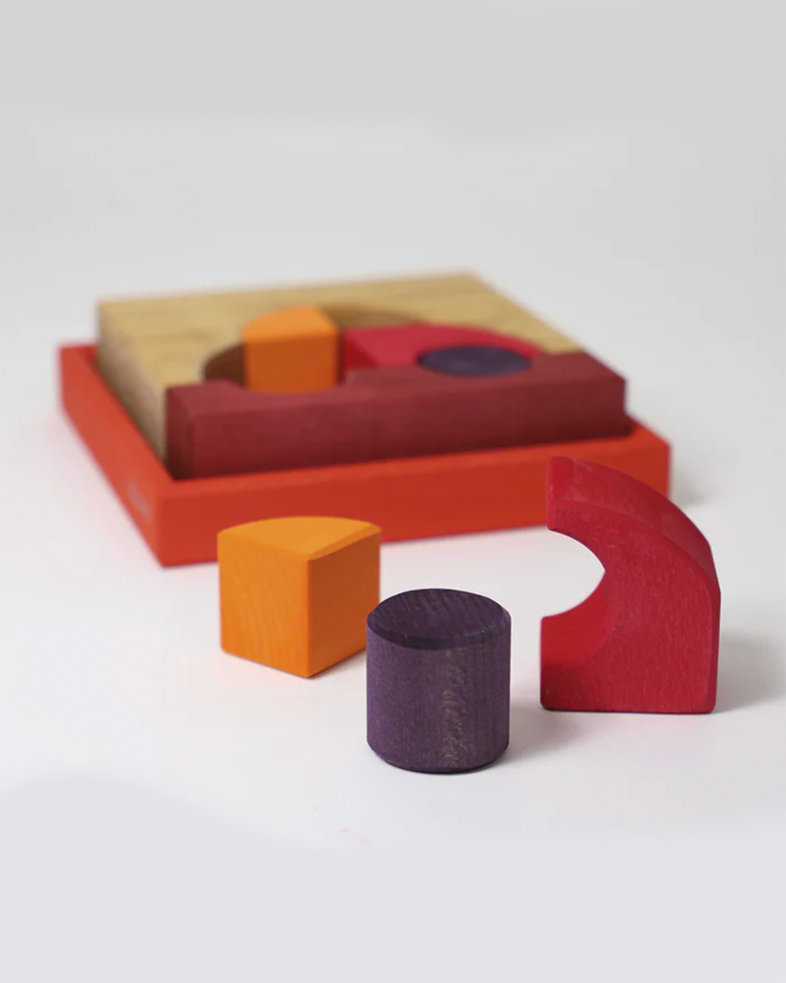 The wooden blocks come in a wooden tray that measures approx 18 cm x 18 cm. The actual blocks are approx. 4 cm thick and made of durable, high quality wood.