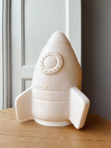 The Spaceship Lamp is made of vinyl, which does not heat up. It is therefore safe to leave the lamp lit during the night, for all those little ones who need a bit of added security while drifting off to sleep.