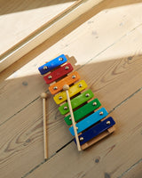 Classic xylophone with 8 keys in wonderful colours. Comes with 2 sticks for playing, and nodes.