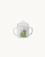 A cute Peter the Rabbit baby sippy cup with a handle on either side and removable top.