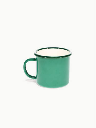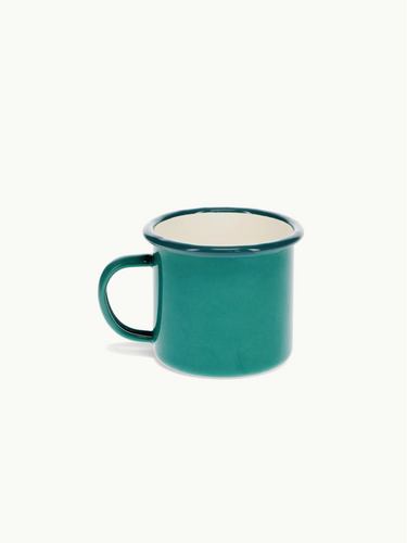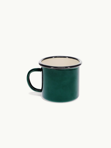 A cute little enamel cup with a handle. Perfect for hot chocolate in the forest or hot tea in the garden at home.
