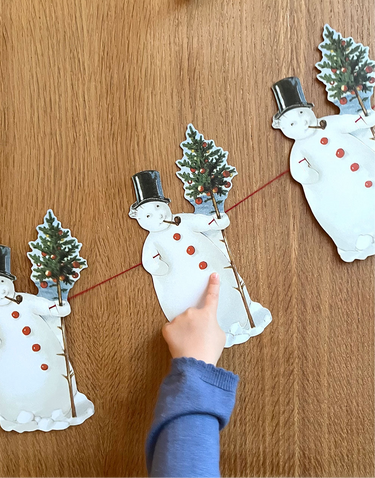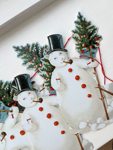 A beautiful and cosy garland featuring ten repeated motifs of a snowman with a Christmas tree.